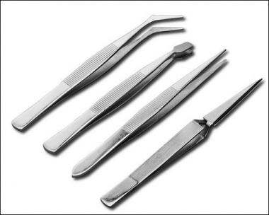 4 verschiedene rostfreie Pinzetten 105 bis 120 mm in Kunststofftasche für viele Anwendungsbereiche.